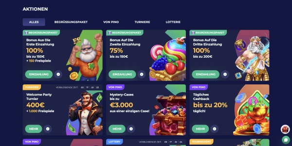 Onze promoties zijn opgebouwd rond stortingsbonussen, cashback en geplande events. Elke aanbieding heeft duidelijke voorwaarden, en je kunt de details altijd bekijken op de promotiepagina voordat je meedoet. casino Pinocasino draait ook netwerkcampagnes met geselecteerde providers, waardoor sommige prijzen en leaderboards afhangen van de regels van de gamestudio.